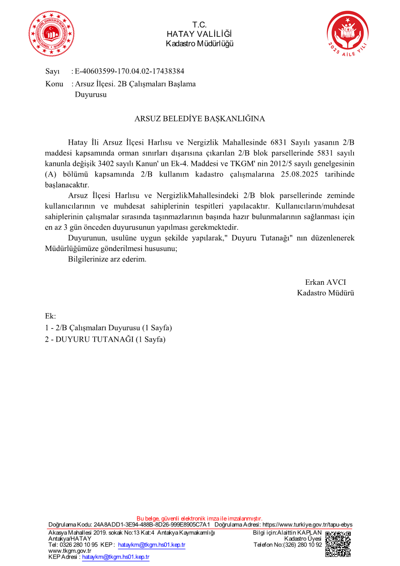 ARSUZ İLÇESİ. 2B ÇALIŞMALARI BAŞLAMA DUYURUSU